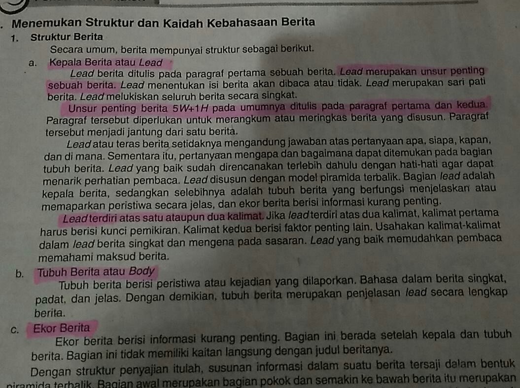 Lead atau teras berita atau kepala berita adalah bagian pembuka teks. Struktur teks berita terdiri dari. Bagian ini disimpan pada bagian kepala berita (lead) dan tubuh berita. Informasi yang biasanya dimuat dalam bagian tubuh berita yakni . Sekitar sungai ciliwung juga diduga sebagai penyebab terjadinya banjir bandang. Bagian ekor berita berada setelah kepala berita dan tubuh berita. Lebih jelasnya kalian bisa melihat beberapa kalimat contoh ekor berita di bawah ini. Struktur teks berita terdiri dari judul berita, kepala berita (lead),. Tuliskan kepala berita, tubuh berita, dan ekor berita dari teks berita tersebut ! Sedangkan dalam penulisannya, struktur teks berita terbagi menjadi tiga bagian, yakni kepala berita (lead), tubuh berita atau isi dan ekor . Berikut ini contoh struktur teks berita. Untuk judul beritanya adalah indonesia terancam resesi, . I.perhatikan teks berita di atas!