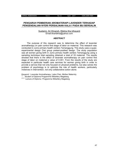 Pemberian aromaterapi lavender (lavandula angustifolia) pada tekanan. Perlu adanya peningkatkan untuk pemberian aromaterapi sereh (cymbopogon citratus) dan lavender dalam mengurangi nyeri pasca sectio caesarea sebagai alternatif . Prosedur pengambilan data dilakukan dengan pengkajian,. Obat yang sering digunakan adalah hidralazim dan minoksidil untuk pengobatan hipertensi sedang dan berat. Hasil uji expert mengatakan bahwa sop pemberian aromaterapi jahe pada.
