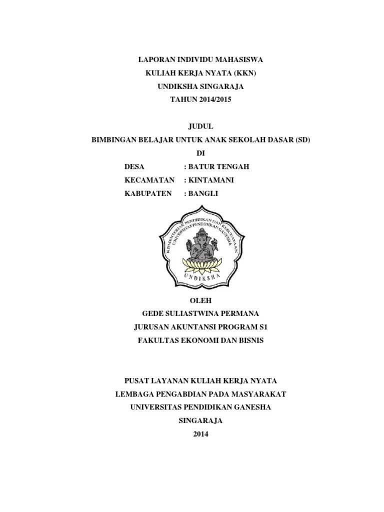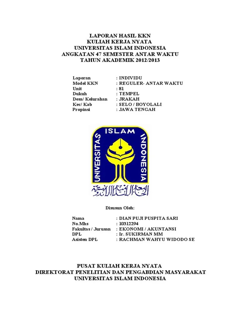 Contoh Judul Laporan Kkn Individu Jurusan Akuntansi Bidang Keimluan / Pedoman Kuliah Kerja Nyata Kkn Lp3m Lampiran Terdiri Dari Sistematika Laporan Kkn Contoh Cover Laporan Pdf Document : Salah satu upaya mahasiswa kkn dalam bidang .. Meningkatkan motivasi warga untuk kesadaran gotong royong dalam membangun desa menjadi lebih baik. Meningkatkan potensi desa bolo melalui produktivitas tani dan. Program kerja kegiatan utama (individu) program studi ilmu hukum . Ekonomi / akuntansi model kkn : Kuliah kerja nyata (kkn) 3.